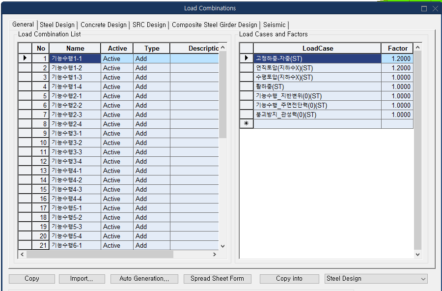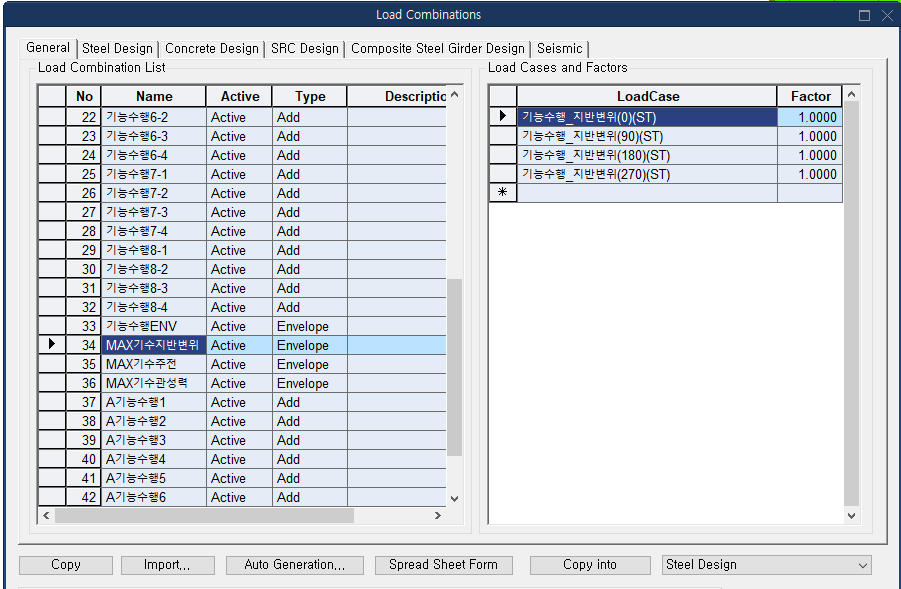 그리고 기능수행 하중조합 8가지를 만들 때 위의 MAX 지진력케이스를 가져오면 기능수행시 하중조합은 8개만 만들면 된다.