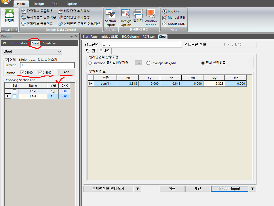 UMD에서는 Steel로 검토하고 싶은데 아무리 요소 번호를 넣고 ADD버튼을 연타해도 데이터가 연동되어 넘어오지 않는다면 보통은 CIVIL에서 하중조합에서 Steel Design부분에 아무것도 없기 때문인 경우가 많다.