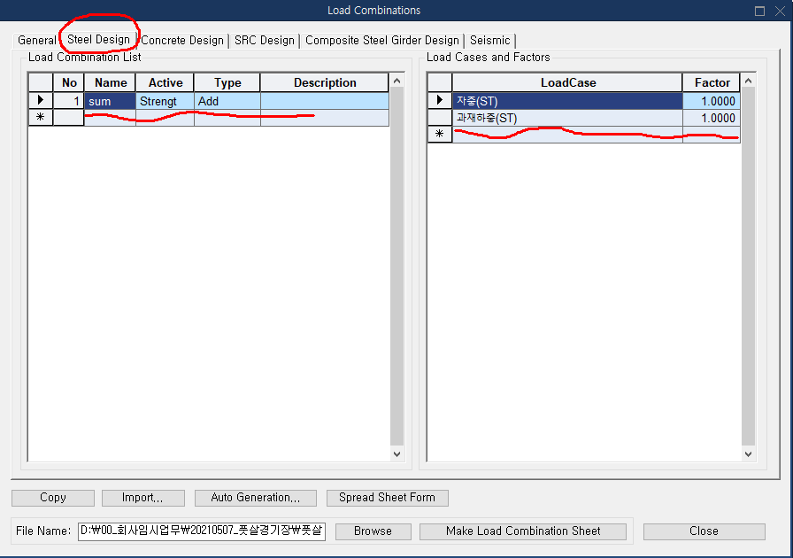 우선 CIVIL에서 Load Combination에서 위에 있는 Steel Design의 하중조합이 있는지를 봐야 한다.
