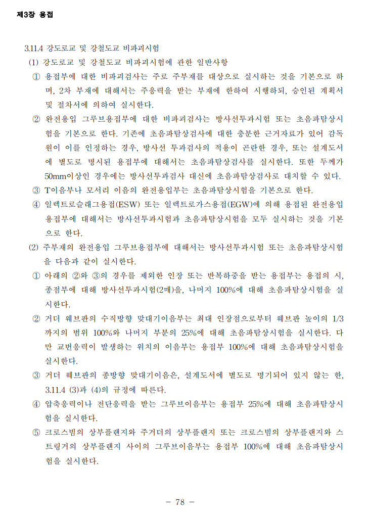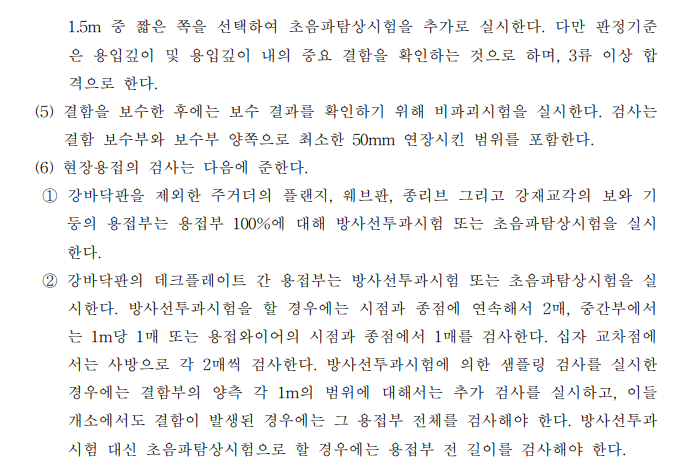 by ✯맞댐용접부(맞대기용접, 그루브용접)는 UT로 하면 되고 그 수량은 '주부재-전체용입'은 전체에 대해 실시하고 '주부재-부분용입'은 1/20 만 실시하면 된다. (안전진단시 보통 주부재의 부분용입구간을 확인할 수 없어서 '주부재-전체용입'으로 보고 전체에 대해 UT를 실시하는 경우가 많다.)
