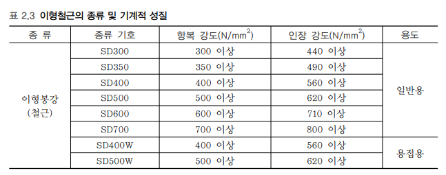 철근의 극한강도(인장강도)는 위 표와 같다.