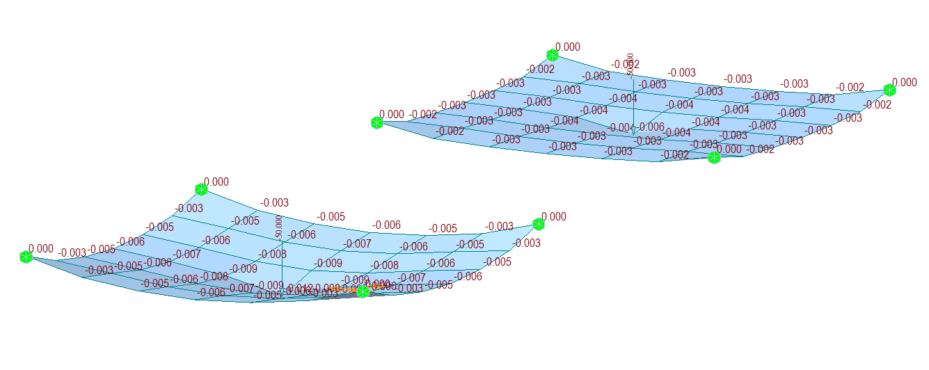 위 그림은 in-plane두께 1m로 만든 6mX6m 판요소망(좌측)과 in-plane두께 1m와 out-of-plane두께 100m로 만든 판요소망(우측)이다. 동일한 집중하중 50kN에 대해 오른쪽의 모델링은 0.006mm의 변위를 보여주고 있다. 이 변위는 out-of-plane두께를 3m~10km까지 변경해봤으나 0.006mm로 동일했다.