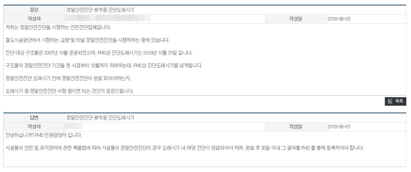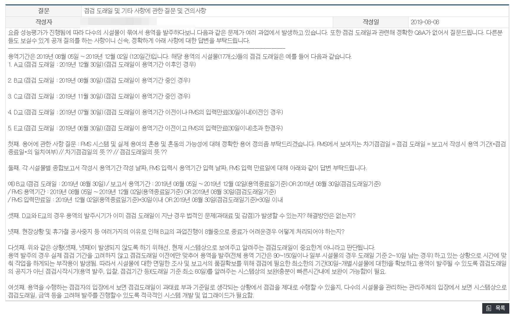 관리주체의 입장에서는 용역발주를 낼 때, 과업기간을 대상시설물들의 도래시기 중 가장 이른 날짜 전으로 잡는 것이 아무 문제가 없는 방법이다.