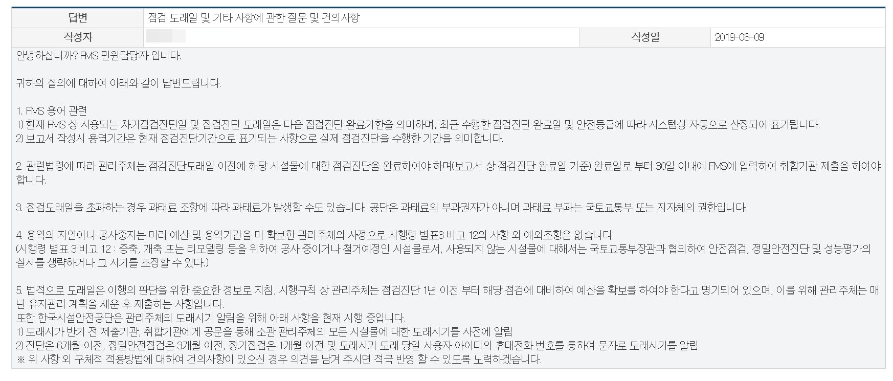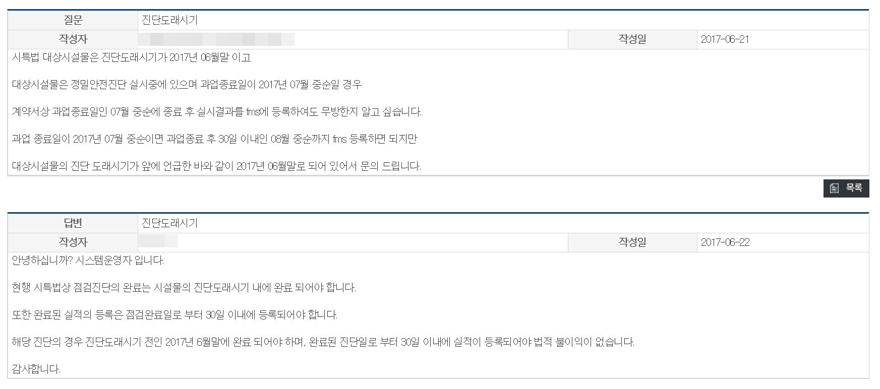 by ✯국토안전관리원(구 시설안전공단)에서는 도래시기와 과업기간에 대해 "점검·진단의 완료는 시설물의 점검·진단도래시기 내에 완료되어야 한다" 또는 "관련법령에 따라 관리주체는 점검진단도래일 이전에 해당 시설물에 대한 점검진단을 완료하여야 한다" 의 입장이다.