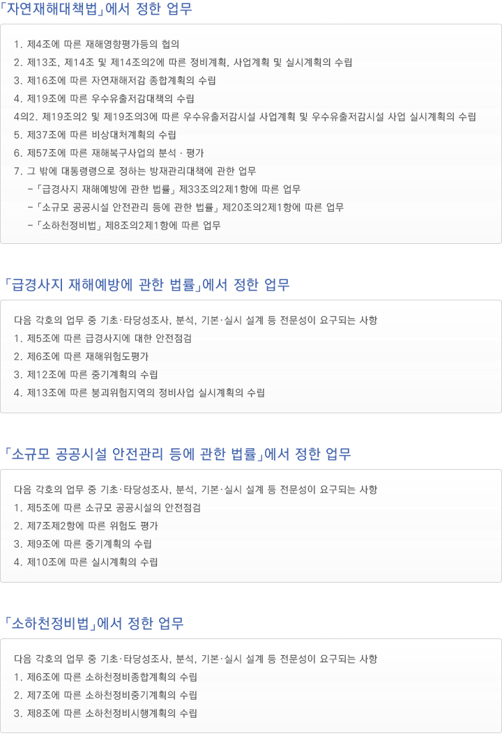아래와 같이 '자연재해대책법', '급경사지 재해예방에 관한 법률', '소교모 공공시설 안전관리 등에 관한 법률' 또는 '소하천정비법'에 의거해서 발주된 과업이어야 하고,
