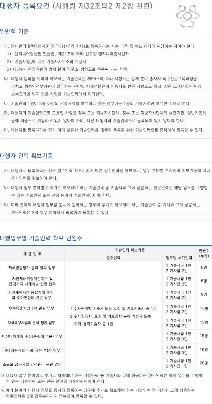 그리고 아래는 인력보유요건에 대한 것인데, 일부 업체들(특히 사장님들이)이 이 요건에 해당하면 방재실적에 올릴 수 있는 거 아니냐고 억지를 부리기도 한다. 거듭 말하지만 위에 언급한 법에 의거해서 발주된, 또 위에 명시된 대행업무만 가능하다.