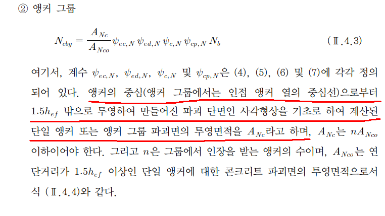 KDS 14 20 54 콘크리트용 앵커 설계기준을 보면 이게 기준인가 싶을 정도로, 필요한 내용들을 다른 기준에 흩뿌려놓은 느낌이다. 기호에 대한 정의는 있으나 참고그림이 없어서 이게 도대체 뭘 말하는 지 이해하기가 쉽지 않다. 내진성능평가요령에 일부 기호에 대한 예시그림이 있어서 참고해야 할 것이다.
