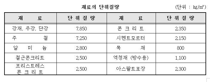 이 기준에서는 희한하게도, 재료의 단위중량을 특별한 경우를 제외하고는 건설공사표준품셈에 따른다고 되어 있다.