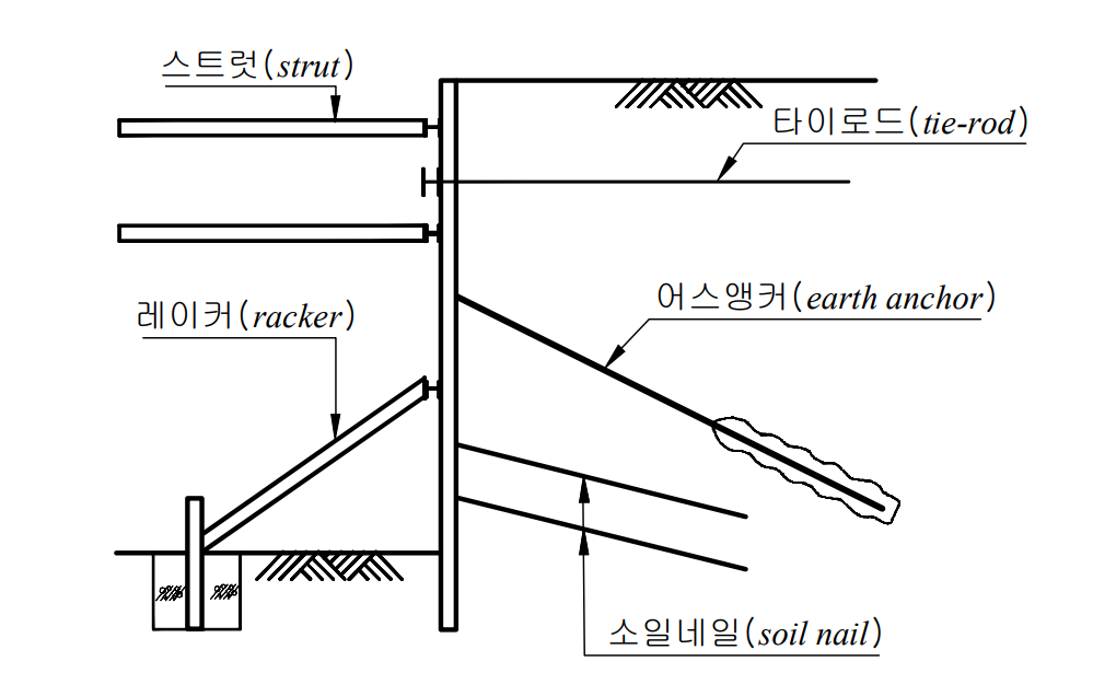 ∙지보공(buttress) : 굴착공사에 있어서 흙막이벽을 지지하는 구조물의 총칭으로 스트럿, 어스앵커, 레이커(raker) 및 네일링 등이 해당된다.