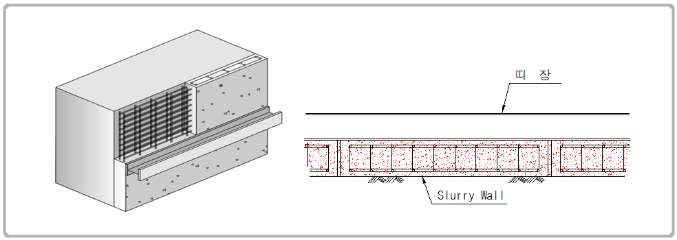 단점 | • 철근망 조립 등의 넓은 작업장이 필요하며, 대형장비 사용으로 교통장애가 크다. • 지장물 간섭시 이설이 필요하다. • 연속벽체의 시공을 위한 철저한 관리가 요구되면 비교적 고가인 공법이다. • 안정액의 처리에 따른 오염 문제가 발생하고, 그 처리비용이 비싸다. • 벽체가 지반 속에서 만들어지기 때문에 정확한 품질관리가 어렵다. • 구조체로 이용하는 경우는 슬러리(Slurry)에 의한 철근의 부착력 및 콘크리트강도 감소와 벽체 결합부의 신뢰성에 유의해야 한다. |
