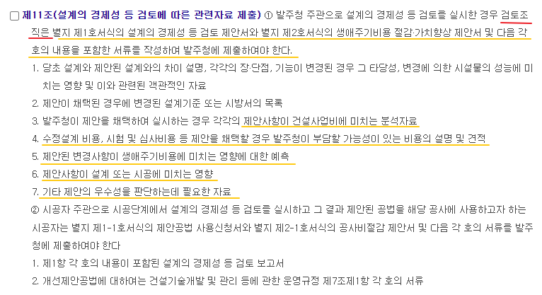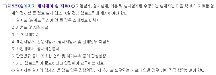'건설기술진흥법 제75조 규정에 의한 설계의 경제성 등 검토' 에 관한 시행지침으로 아래의 기준이 있다.