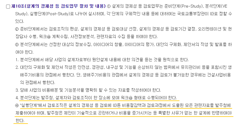 제10조 설계의 경제성 등 검토업무 절차 및 내용 :: ... 4. 분석단계는 발주청, 설계자와 검토조직이 한 장소에 모여 워크숍 형태로 수행되어야 한다.