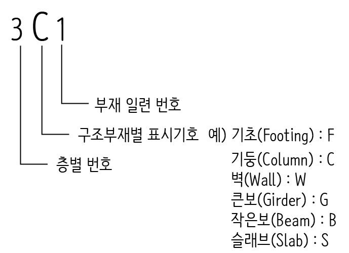 이때 각각의 부재 상세는 층별로 달라질 수 있기 때문에 맨 앞에 층을 나타내는 숫자를 먼저 표기합니다. 기둥을 보더라도 위로 올라갈수록 크기가 줄어드는 것이 일반적입니다. 지하층이라면 - 기호를 붙입니다. 지하 3층이라면 -3입니다.