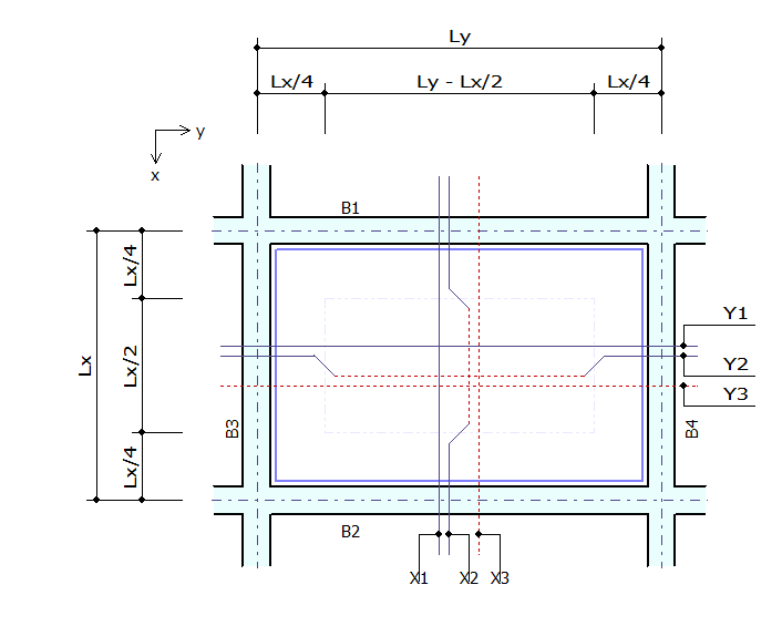 Y1 철근 : y방향 상부철근. 배근유형 'B'에선 지간 전체에 배근된다.