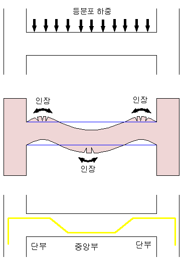 그러는 바람에 단부에서는 위로 휘고 중앙부는 아래로 휜다.