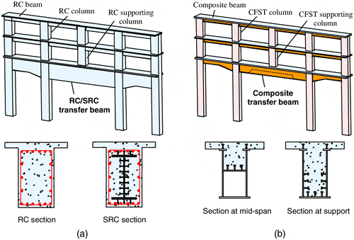 전이보는 아래 그림과 같이 기둥이 내려오다가 '전이층' 부터 기둥이 없어지고 그 축력을 거대한 보로 분산시키는 개념이다. (요기에서 그림을 퍼왔다)