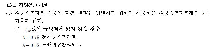 여기서 ∙ : λ 라는 계수가 나오는데 이는 경량콘크리트계수로 KDS 14 20 10(4.4)를 참조하라고 나온다.