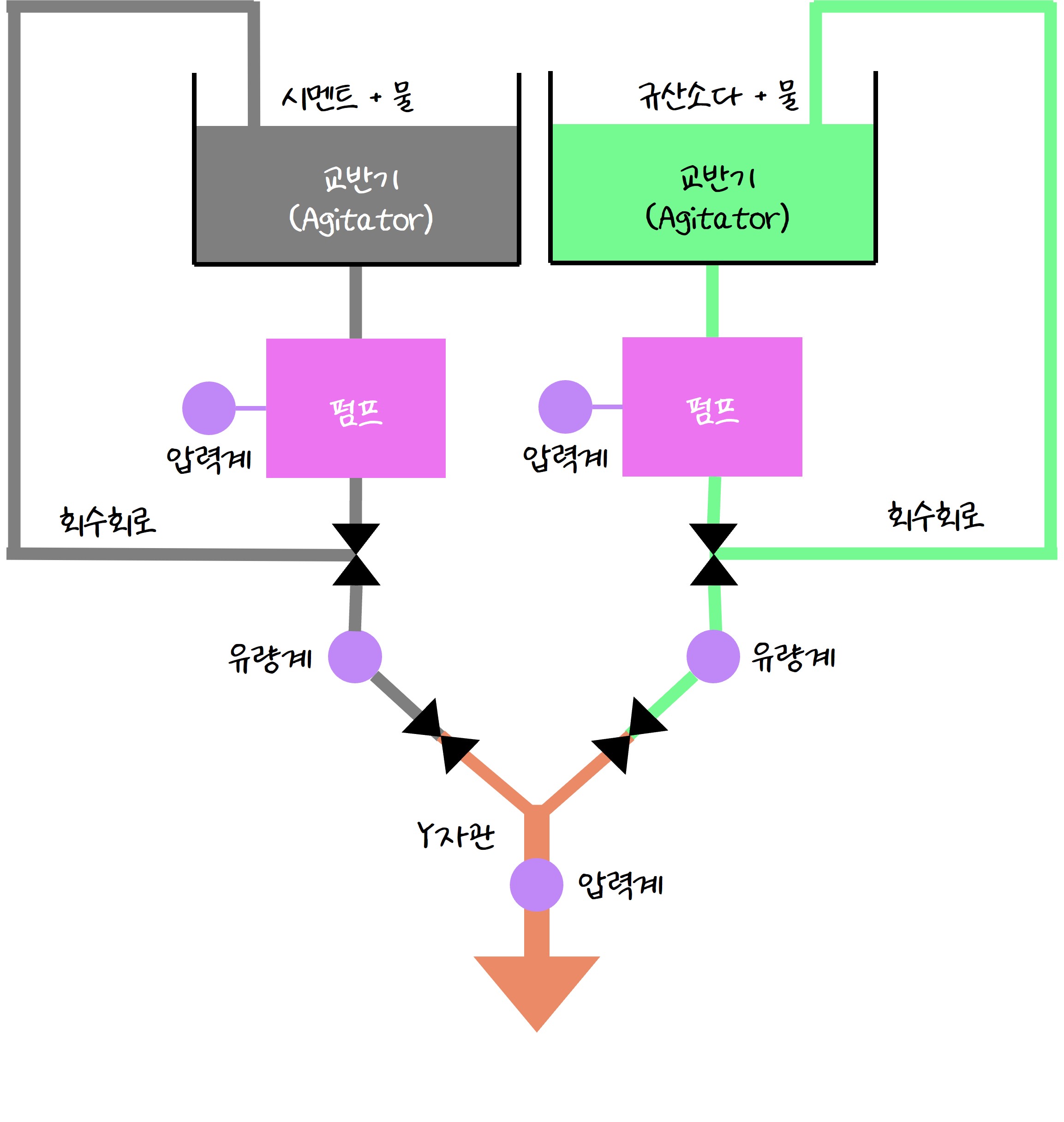 LW는 불안정화한 물유리(규산소다)를 뜻하는 독일어입니다. 규산소다 수용액과 시멘트 현탁액을 혼합하여 Y자관을 이용해 지반에 주입하는 방식입니다. 시멘트 성분인 규산3석회(3CaO·SiO₂)와 물유리 속의 규산이온과 결합하여 규산수화물로 겔화되어 지반이 고결됩니다.