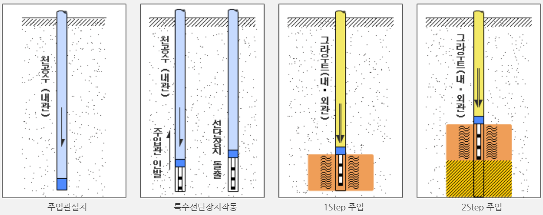 소정의 심도까지 천공(Φ40.2 ㎜)한 후, 천공 선단부에 부착한 주입장치(rocket system)로 유도공간(space)을 형성한 후 1단계씩 상승하면서 주입하는 방식입니다. 주입압은 저압(0.3~0.5 MPa)으로 하고, 원 지반을 교란시키지 않습니다.