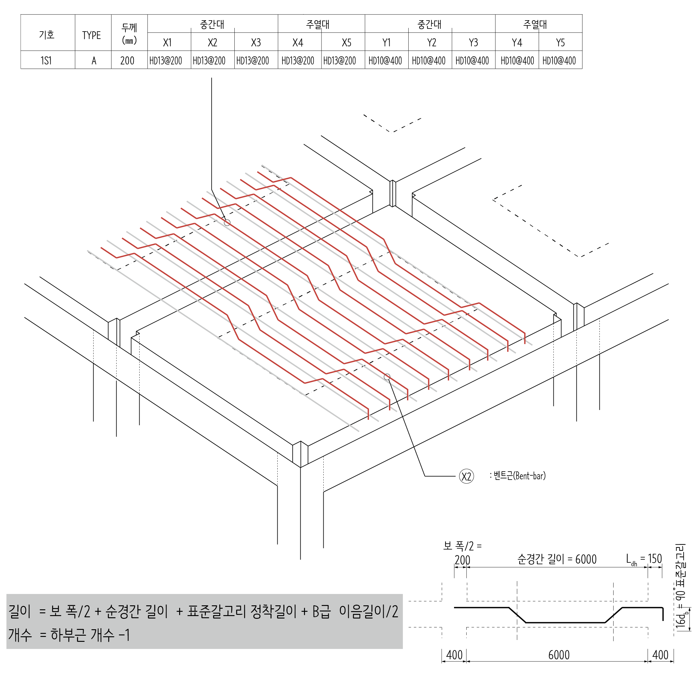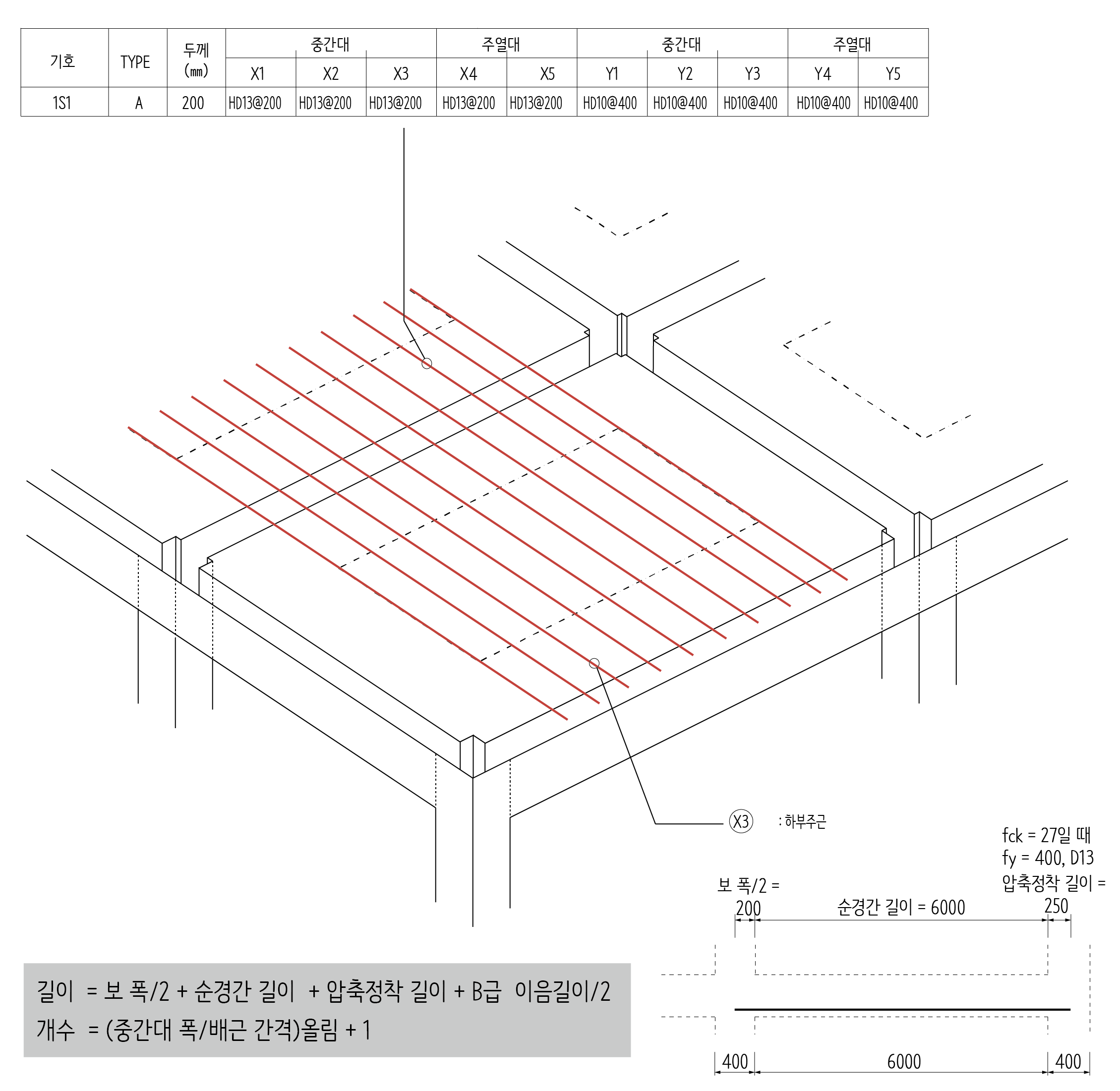 단변방향 하부근은 슬래브에서 가장 힘을 많이 받는 중요한 철근입니다. 슬래브가 연속되어 있다면 이 철근은 인접 경간으로 연속해서 배치합니다.