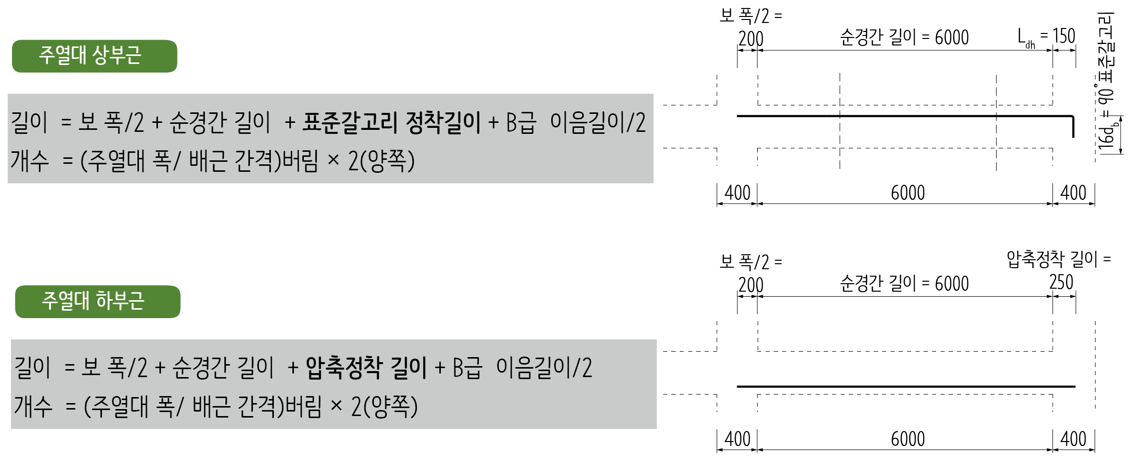 주열대 철근의 길이를 산정할 때는 상부근과 하부근의 정착조건이 다르기 때문에 구분해야 합니다. 상부철근은 인장을 받는 정착길이로 하부철근은 압축을 받는 정착길이를 적용합니다. 이미 앞에서 설명한 것으로 충분하리라 생각합니다.