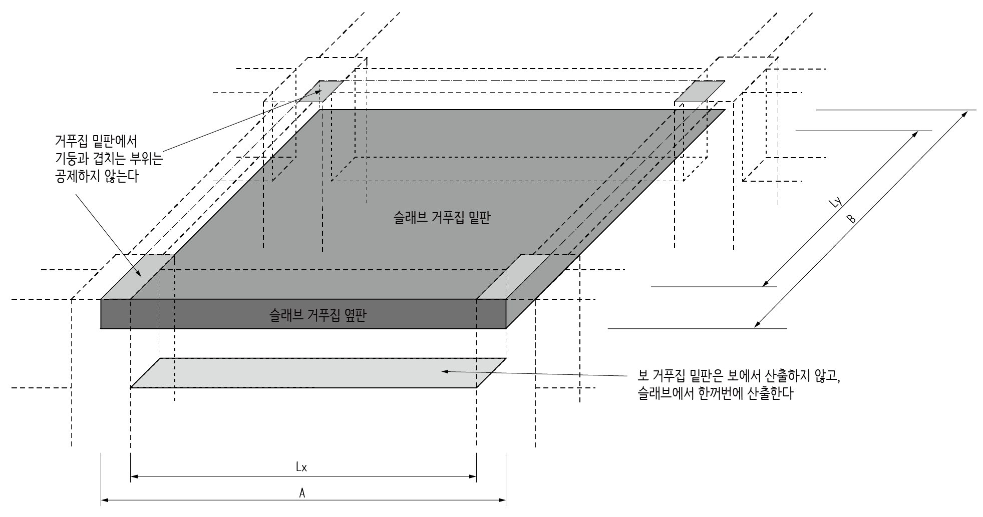 콘크리트의 수량은 슬래브의 체적(m³)으로, 거푸집은 거푸집을 설치하는 표면의 면적(m²)으로 산출합니다.