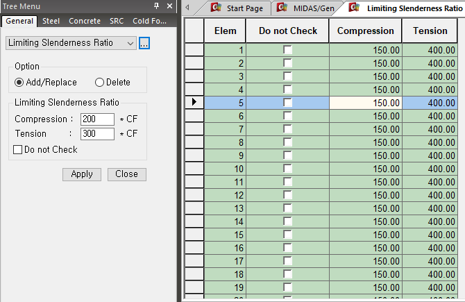Design > General Design Parameter > Limiting Slenderness Ratio 에서 'Do not Check'를 적용한 경우에는 한계세장비 검토를 하지 않습니다.