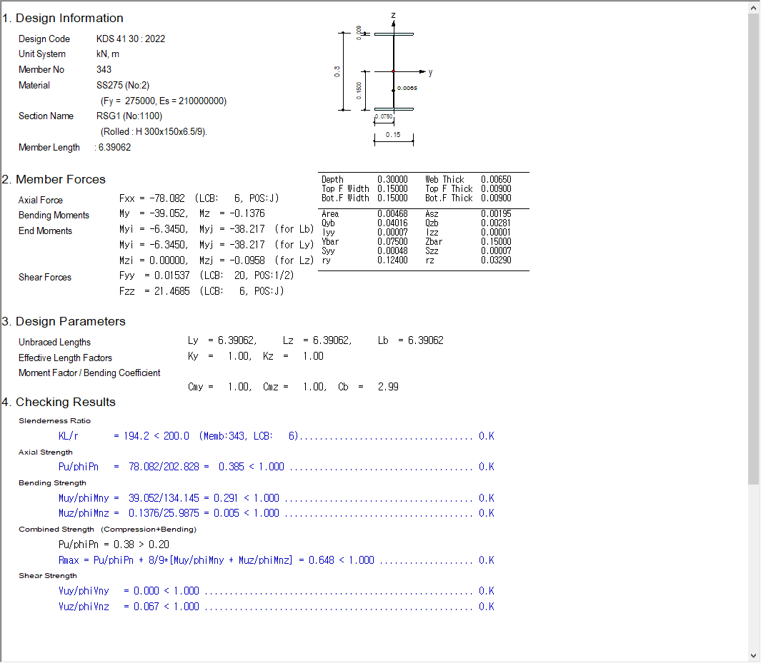 다른 한 결과에서는 Deflection(변형) 및 Slenderness Ratio(세장비)에서 NG가 발생하는 것으로 보아 모델링 상의 구속조건와 같은 변수설정에 따라 값이 바뀔 수 있을 것라 판단되어 문의드립니다.(이건 이전에 문의드렸던 코드결과 확인값과 다른 건인 듯합니다)