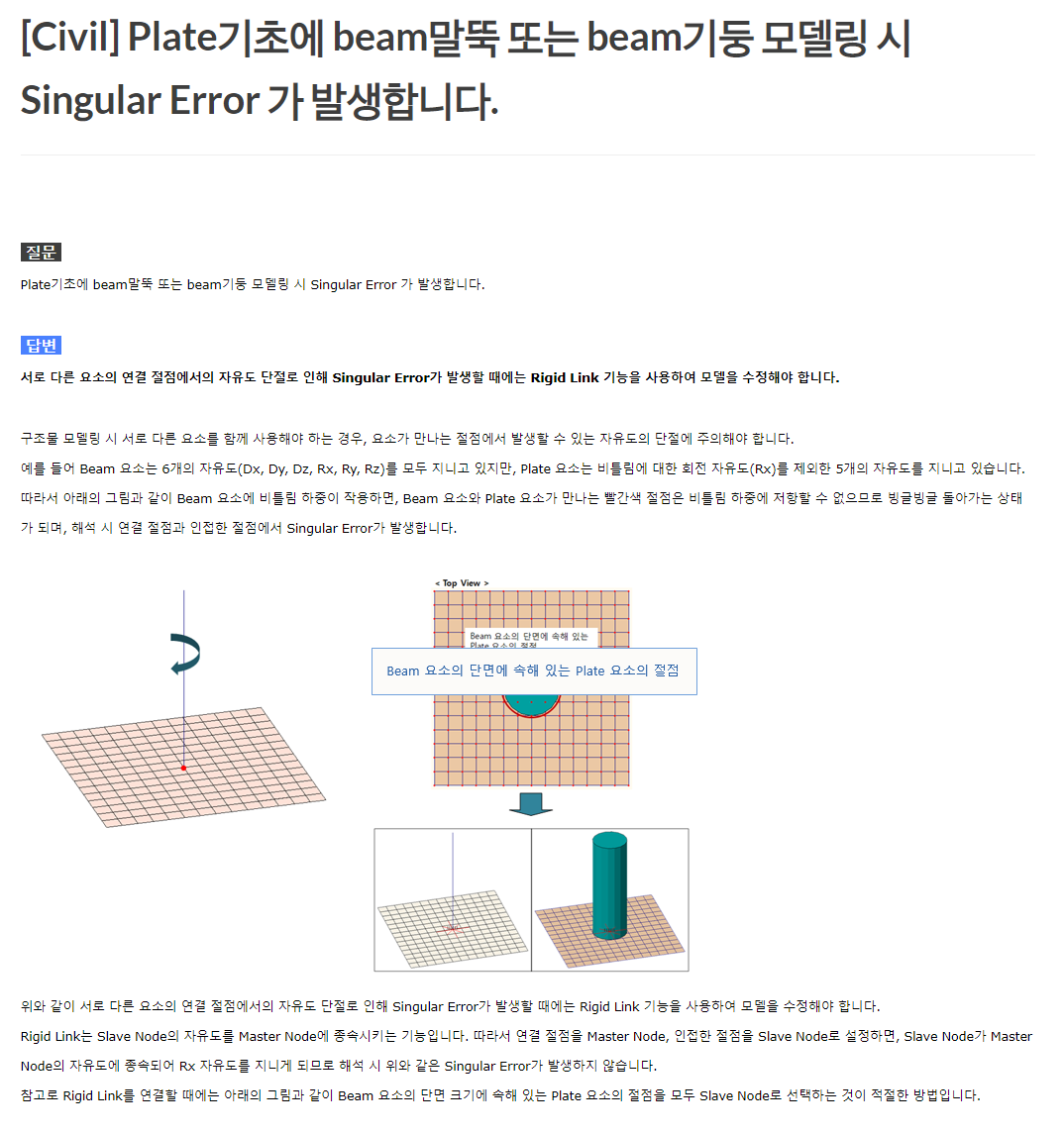 질문 : Plate기초에 beam말뚝 또는 beam기둥 모델링 시 Singular Error 가 발생합니다.