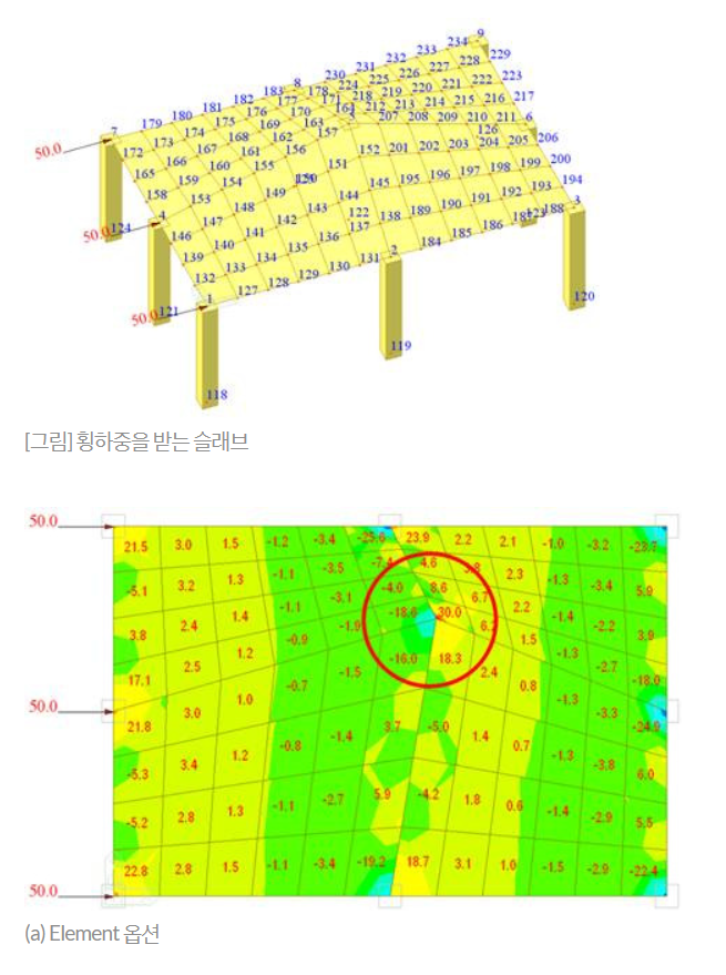 2. 횡하중을 받는 슬래브의 Mxx를 확인하면 Element 옵션의 값과 Avg. Nodal의 값이 큰 차이를 보이고 있습니다. 그 이유는 그림 4(a)에서와 같이 기둥을 중심으로 슬래브의 좌측의 Mxx와 우측의 Mxx를 비교하면 크기는 거의동일하고, 부호가 반대인 것을 알 수 있습니다. Avg. Nodal은 기둥절점에 연결된 요소들의 단위길이당 휨모멘트를 평균하기 때문에 값이 왜곡되어 표시되므로 적절하지 않습니다