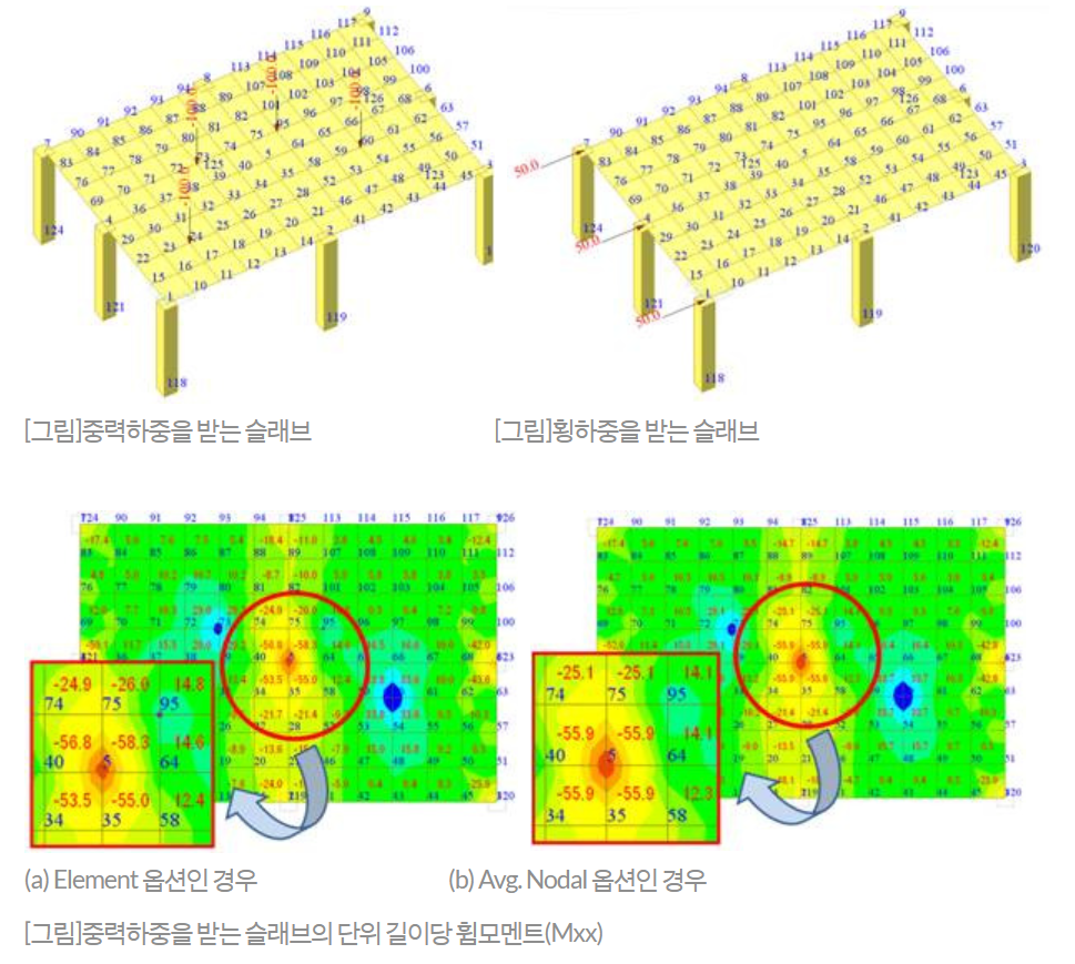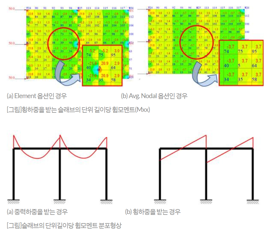 1. 중력하중을 받는 슬래브의 Mxx를 확인하면 Element 옵션의 값과 Avg. Nodal의 값이 큰 차이를 보이고 있지 않습니다.