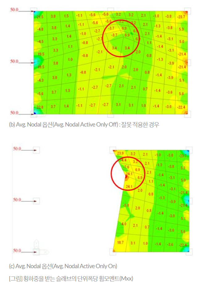 슬래브를 상세 해석을 하여 단위 길이당 휨모멘트 Mxx값을 확인 하려고 합니다. Plate Force Options에서 Element와 Avg. Nodal은 어느 경우에 사용하나요?