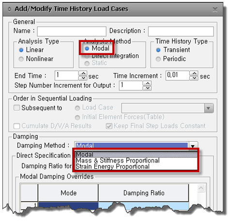 - 시간이력해석 방법을 Modal(모드중첩법)로 선택할 경우에는 고유치해석을 우선적으로 수행해야 합니다.