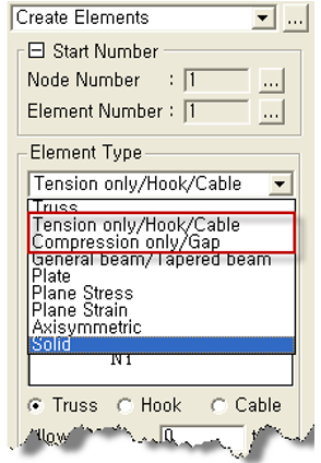 1) 요소 : Tension only/Hook/Cable, Compression only/Gap 요소는 Truss 요소로 치환하여 해석