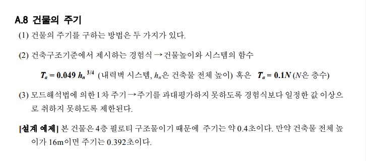 만약 국내설계라면 주기는 아래와 같이 간략식으로 구할 수 있다. 이번예제로 하면 T = 0.315 s 가 나온다. (두 배 이상 차이가 나지만 어쩔 수 없다. 주기를 구하기 위해 구조해석모델링을 하지 않는다면 이 간략식을 쓸 수 밖에 없다.)