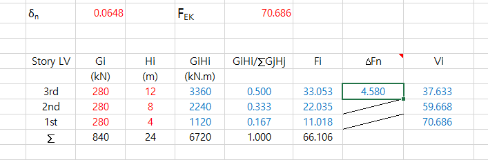 그리고 ΔFn 도 위 식 5.2.1-3 에 의해 δn X F_EK = 0.0648 * 70.686 = 4.58 kN 이 산출된다. (소숫점 문제로 아래의 표의 값이랑 살짝 다르지만 무시해도 될 수준)