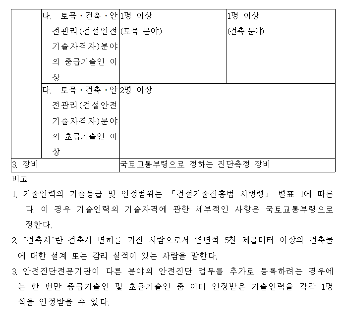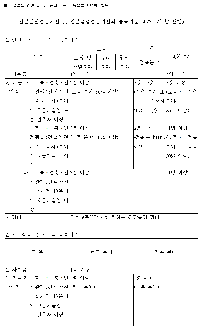 안전진단전문기관 및 안전점검전문기관의 등록기준 부분은 아래와 같다.