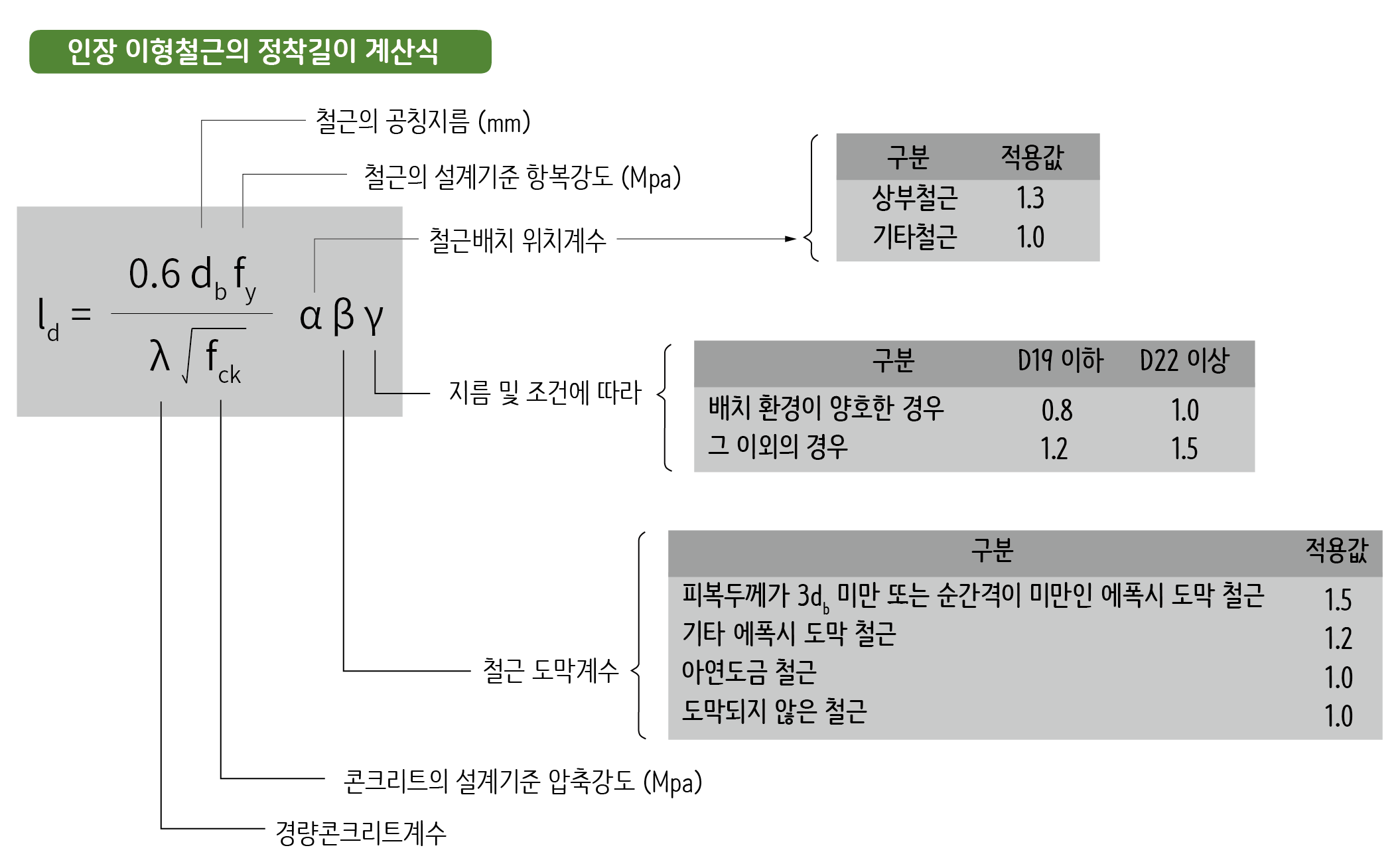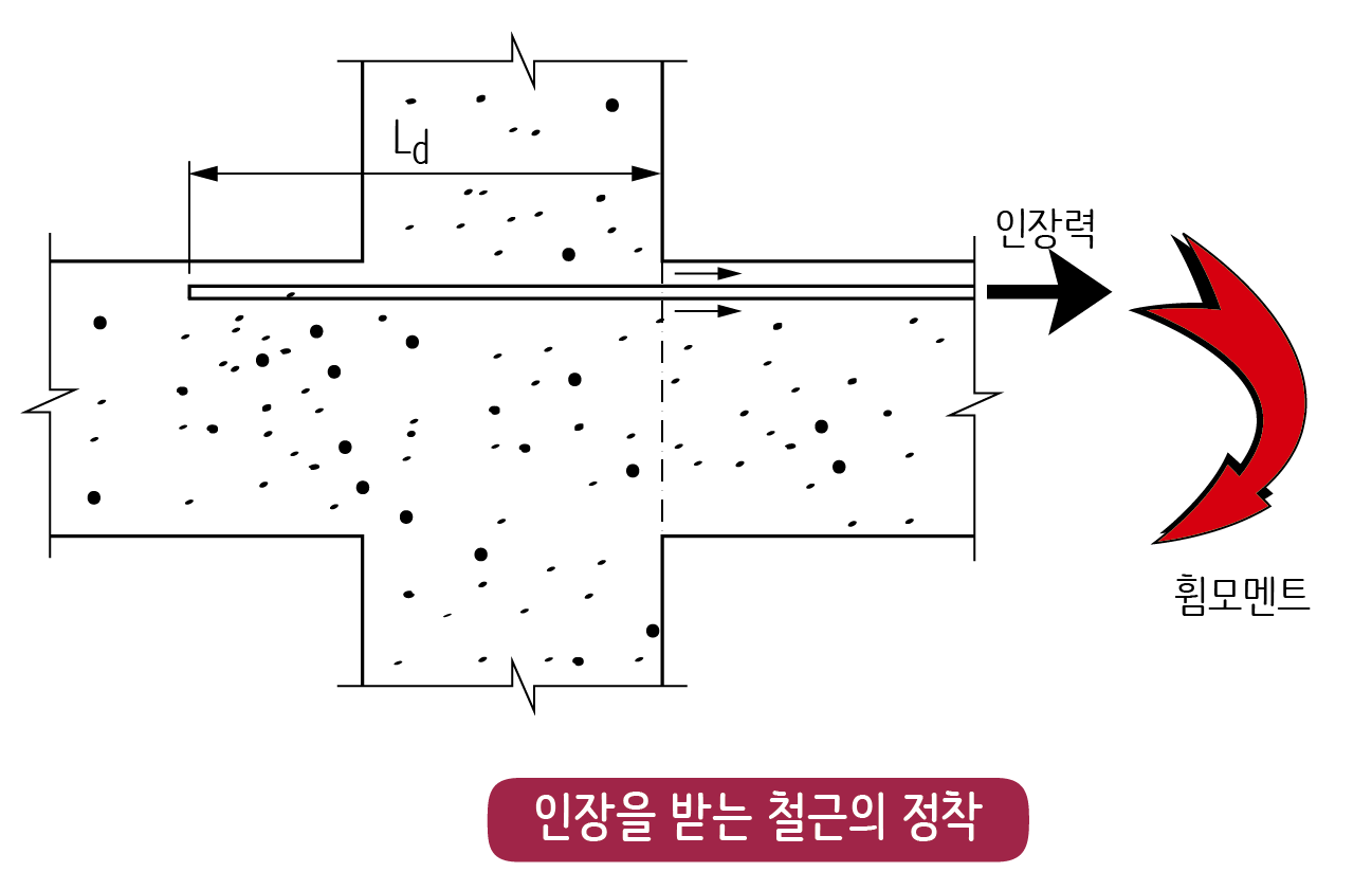 철근은 주로 인장력을 부담하기 때문에 콘크리트 속에서 뽑히지 않도록 충분히 정착하는 것은 중요한 문제입니다. 여기서 중요한 것이 어느 정도 콘크리트 속에 묻어야 뽑히지 않는가를 정하는 것인데, 구조설계기준에서 제시하는 식이 조금 복잡해서 헷갈리는 경우가 많습니다. 우선 명심해야 할 것은 표준갈고리를 만들어 정착할 때와 그렇지 않을 때를 명확히 구분해야 합니다.