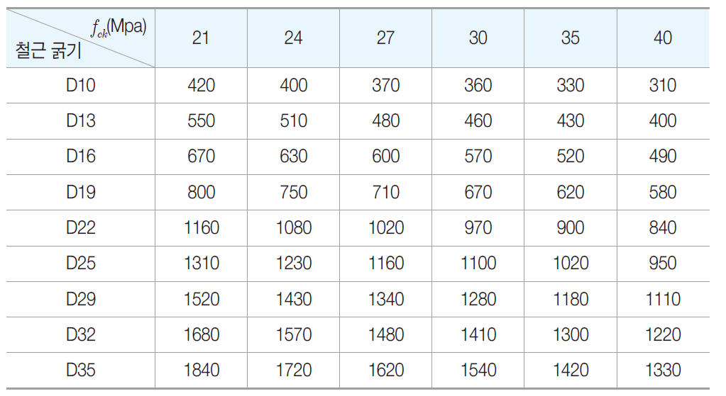 철근이 배치된 상황을 모두 고려해서 적절한 정착길이를 반영한다는 취지는 이해하지만 이렇게 복잡해서는 사용하기가 어렵습니다. 그래서 구조설계도면 앞쪽 일반주기사항에는 이 값을 표로 정리해서 제시하고 있습니다. 정착길이에 대한 기본 개념을 이해해야하겠지만 사용할 때는 이 표만 잘 읽어내면 됩니다.