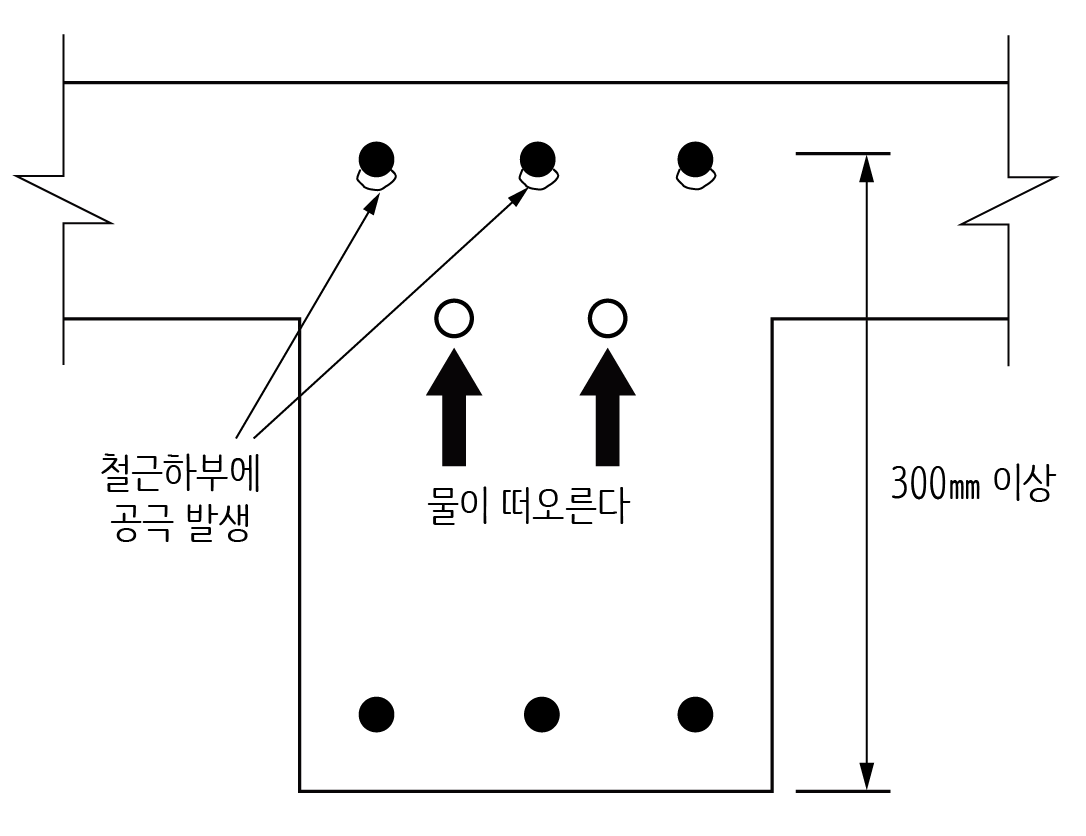 타설 직후의 콘크리트는 굳지 않은 상태(gel 상태)이기 때문에 재료분리가 일어납니다. 자갈은 무겁고 물이 상대적으로 가볍기 때문에 분리됩니다. 비중이 상대적으로 작은 물(+이물질)이 떠오르는데 이를 블리딩(bleeding: 콘크리트의 재료분리 현상의 일종)이라고 합니다. 이 블리딩 현상때문에 물이 떠오르다가 철근과 만나게 되면 철근에 붙어서 그대로 남게 됩니다. 즉 철근 밑에 빈 공간이 생기게 됩니다. 당연히 콘크리트가 철근을 붙잡는 힘이 약해지겠죠.