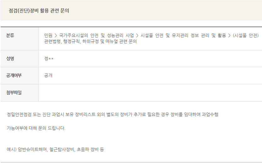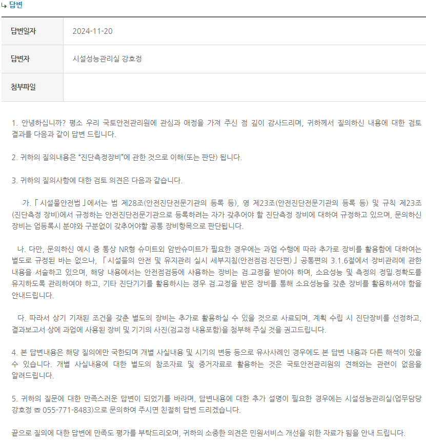 그냥 참고만 할 수 있을 것 같은데, 진단기관 등록장비가 아닌 장비(ex:암반용 슈미트해머)를 임대해서 사용해도 되는지에 대한 질문이고 답변에는 검교정만 제대로 받고 있는 장비면 사용할 수 있다고 한다. 단, 보고서에 그 장비의 검교정 필증 등을 첨부하는 것을 권고하고 있다.