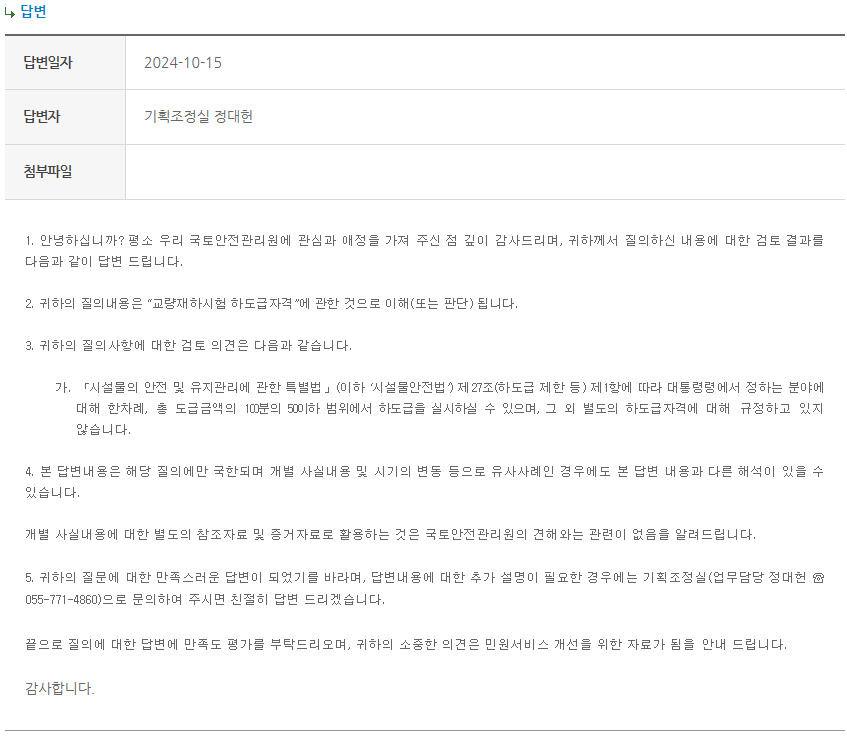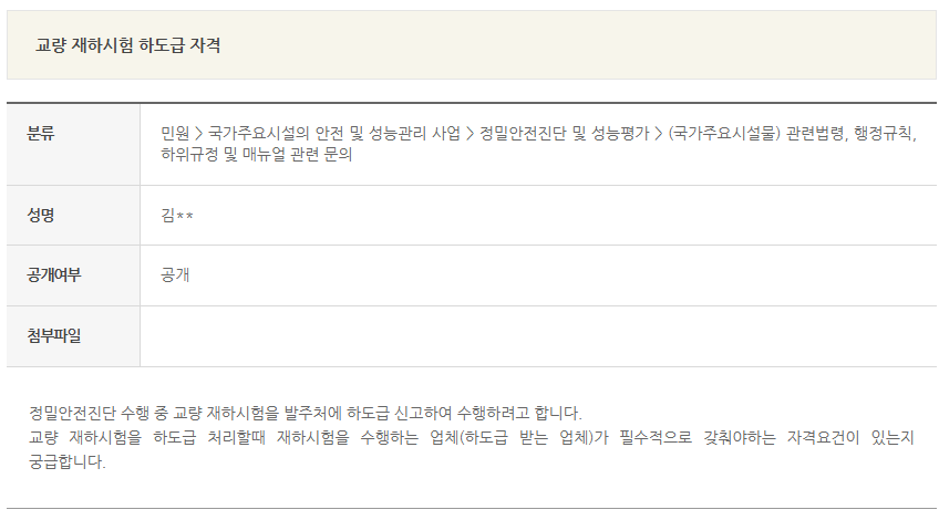 어떤 업체는 재하시험을 안전진단전문기관에만 하도급을 보내기도 해서 혼란스러웠는데 국토안전관리원에 비슷한 문의글이 있길래 캡쳐해온다.