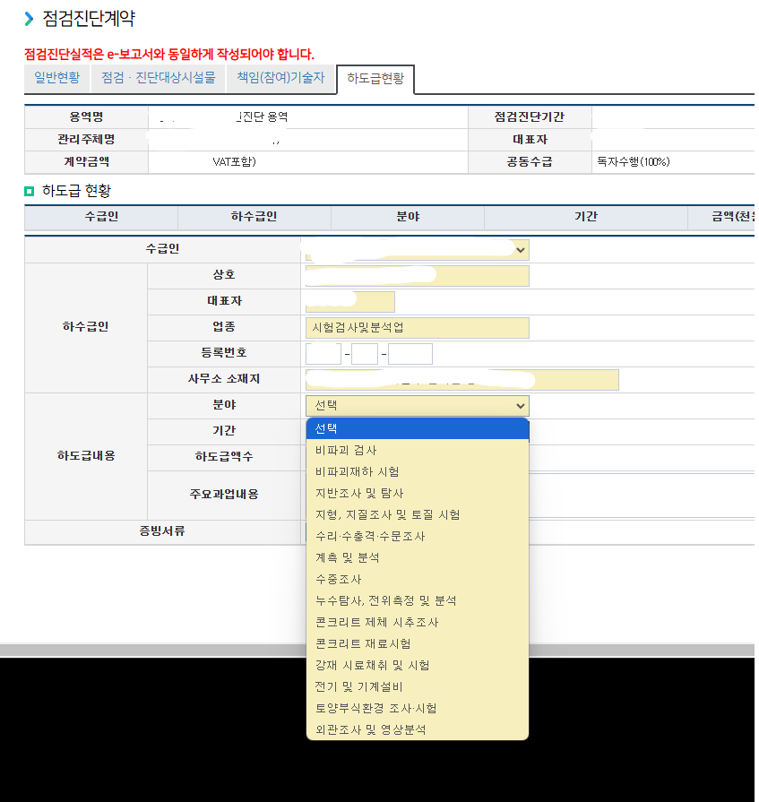 이후 FMS 전상상에 '점검진단계약/하도급현황'에서 하도급 내용을 입력해야 하는데,