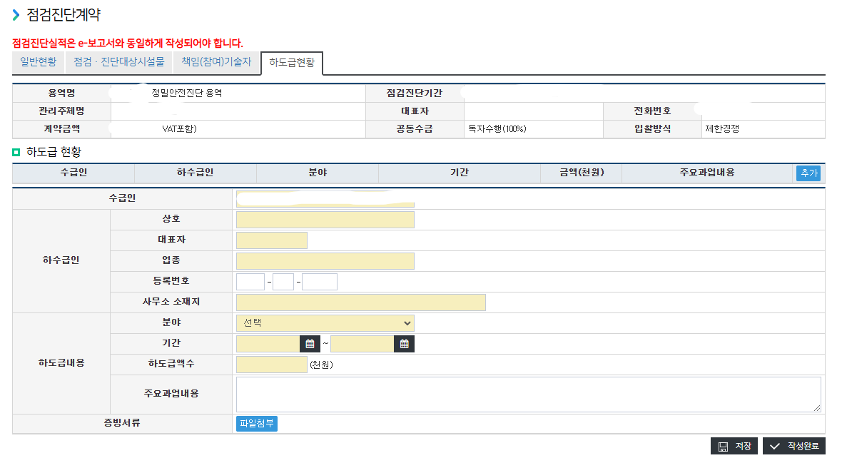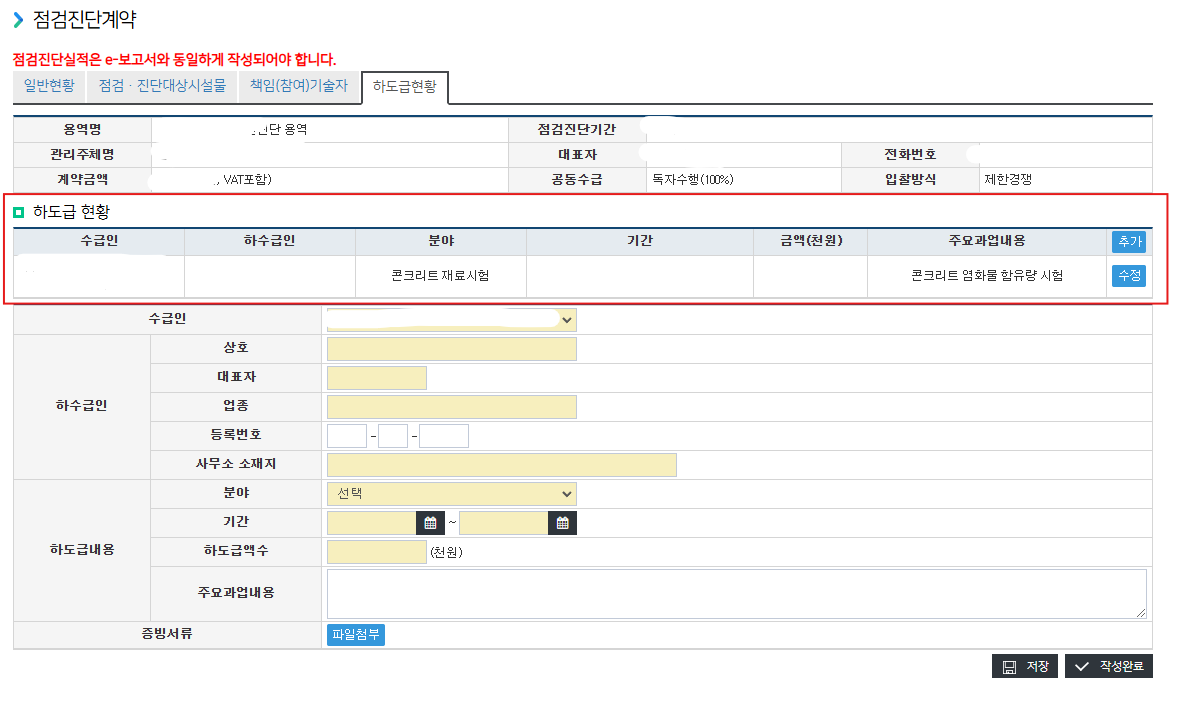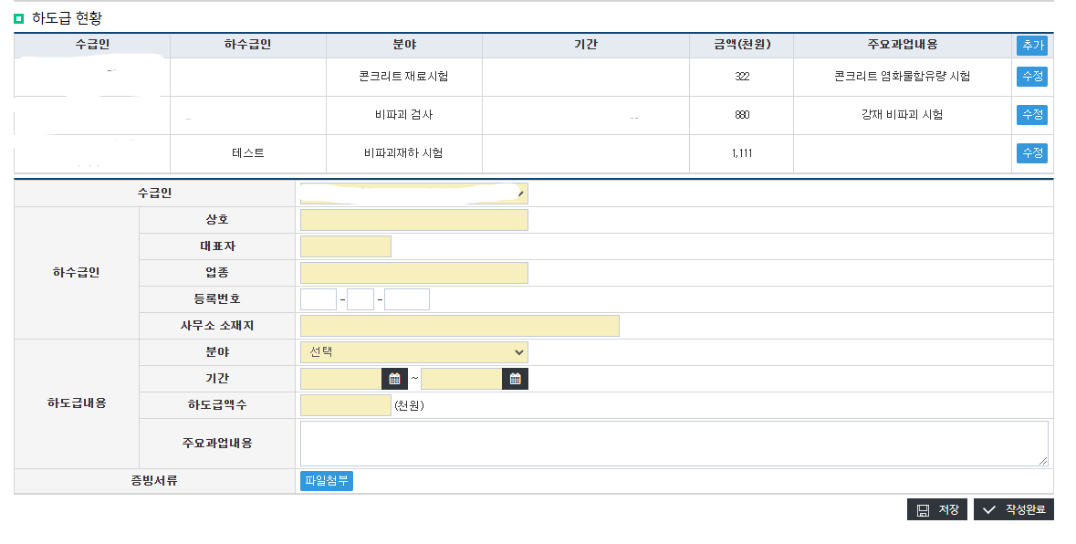 즉, "작성완료"버튼은 모든 하도급 들을 입력 및 "저장"한 후에 최종적으로 누르는 버튼이다.