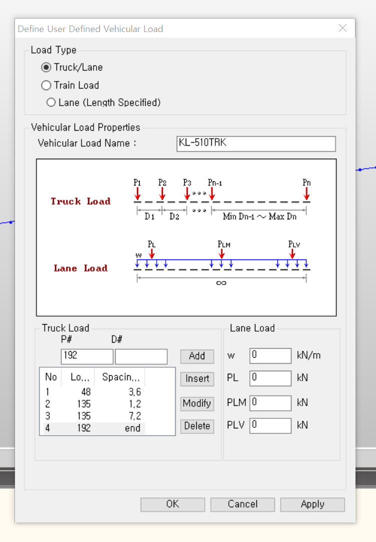 by ✯Load 메뉴에서 Load Type을 Moving Load로 하면 그 우측 메뉴가 변화하는데 그 중 Vehicles를 누르면 차량하중을 정의하는 창이 뜬다. KL-510 활하중을 "Add User Defined"로 구현하려면 아래와 같이 하면 된다.