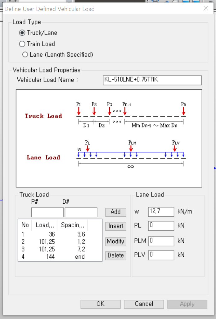 차로하중과 트럭하중의 조합을 위해서는 아래와 같은 방식을 이용할 수 있다. 트럭하중의 75% 등은 자동으로 계산되지 않기 때문에 직접 계산해서 입력해야 할 수 있다.
