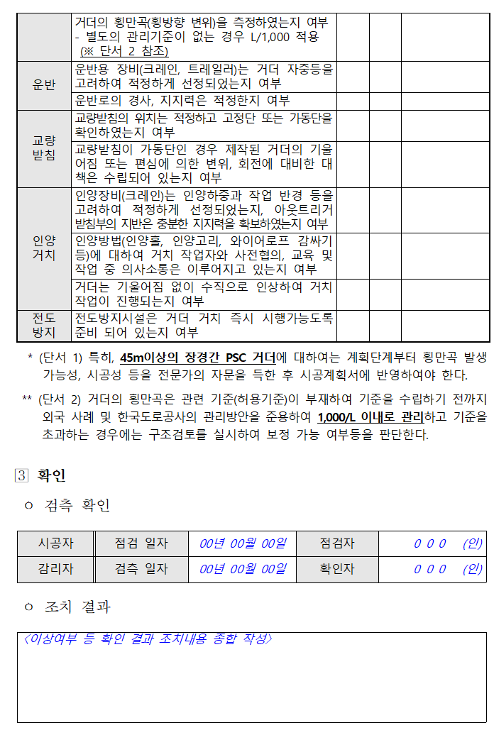 PSC 거더 제작,인양,거치 시 점검 체크리스트