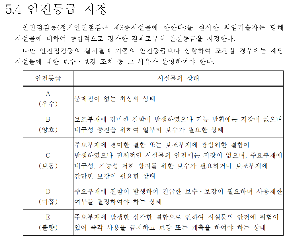 시설물의 안전 및 유지관리 실시 세부지침(2024.12) 공통편에서는 아래와 같이 안전등급을 정의하고 있다. 하지만 주의해야 할 부분이 있다. "안전점검등(정기안전점검은 제3종시설물에 한한다)"라고 되어 있기 때문이다. 즉, 1,2종 시설물의 정기안전점검은 이렇게 5가지 등급표로 등급산정하는 방식에 해당하지 않는다.