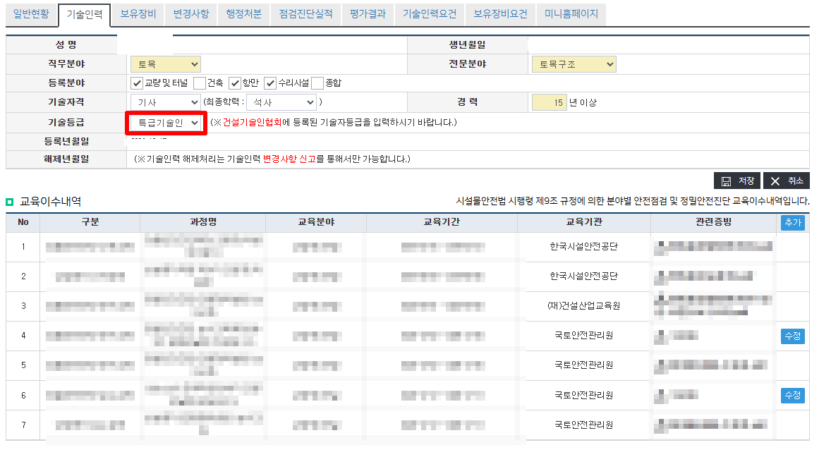 점검진단기관정보 / 안전진단전문기관 -> 기술인력탭 -> 해당기술인클릭 -> 기술등급 수정 ->저장