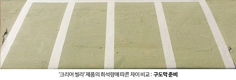 맨 왼쪽부터 첫번째 구간은 크리어 씰라를 도장하지 않고, 두번째 구간은 크리어 씰라를 희석없이 도장,